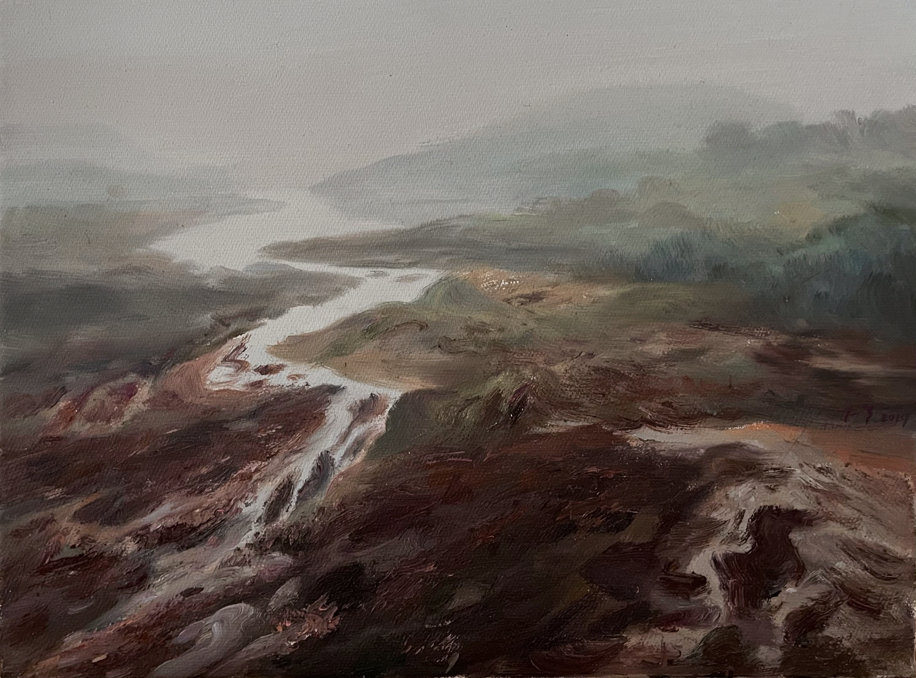 这种向上地域的探索,也暗含着他对油画原土化的想考。作为国画专科出身的艺术家,他尝试将中国画中“笔、气、境界”的精髓融入油画创作:用写意的笔法勾画山峦抽象,以留白营造悠远境界。“油画是外来画种,但当我用形色家乡的脸色去画故国江山,用中国东谈主的审好意思融会色调与线条,简略就能走出一条原土化的新路。”