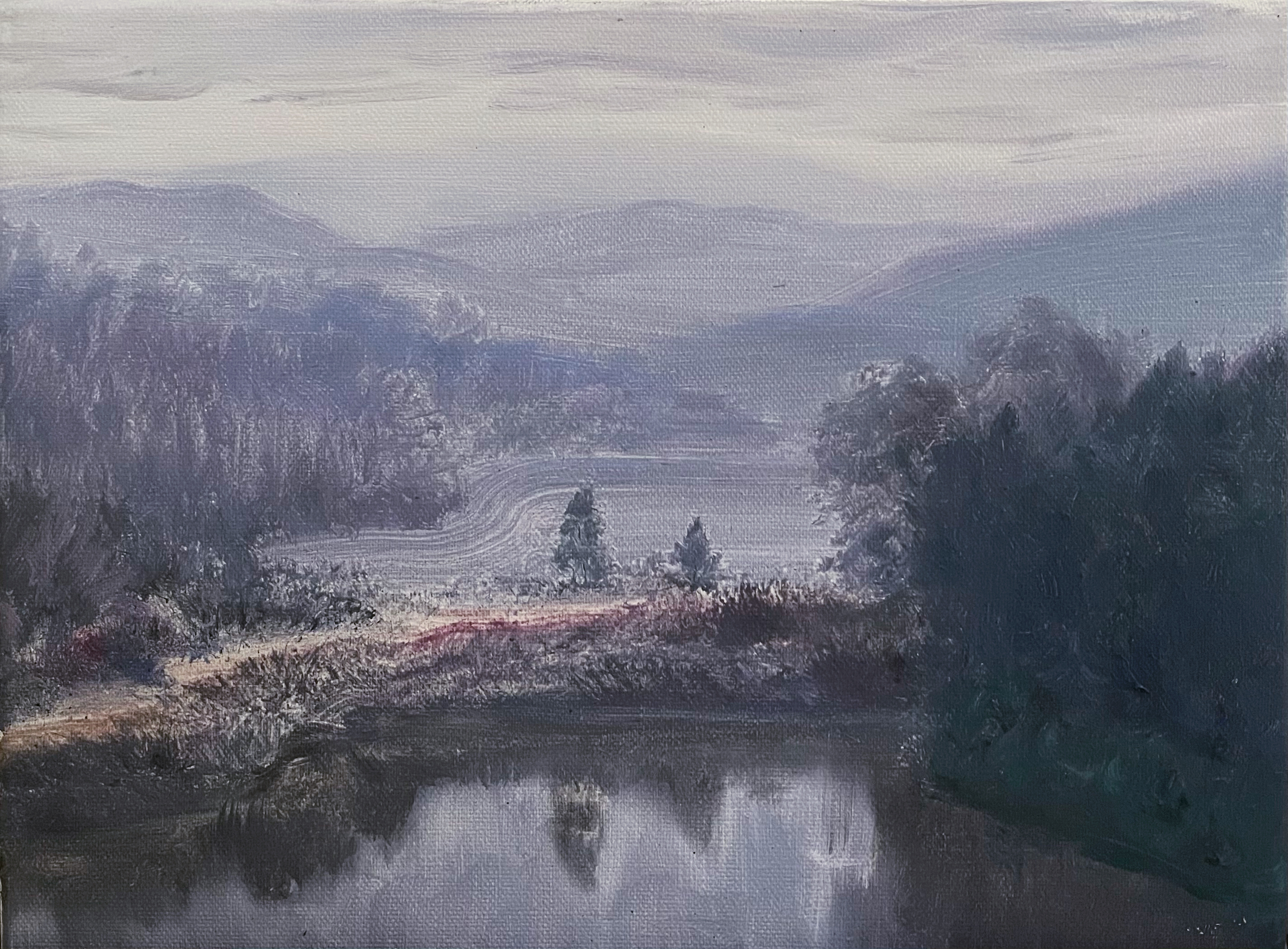 对袁锋渊而言,桑梓的景观不单是视觉标识,而是一种乡情操心,是创作灵感的起头,亦然他不雅察宇宙、融会宇宙的一个出口。在《拂晓》系列中,他画的如故家乡雷州半岛的故事,他刻意强化了雷州半岛特有的湿润雾气,画面中若存若一火的农舍抽象与褭褭炊烟,组成了一种带着体温的视觉操心。在他的操心中,“这些雾水是有分量的,就像小时候趴在母亲背上感受到的湿度与温度。”和大多艺术家将乡愁作为创作母题访佛,袁锋渊也把这种将地舆特征调整为脸色载体的智力,形成了他艺术抒发的底色。